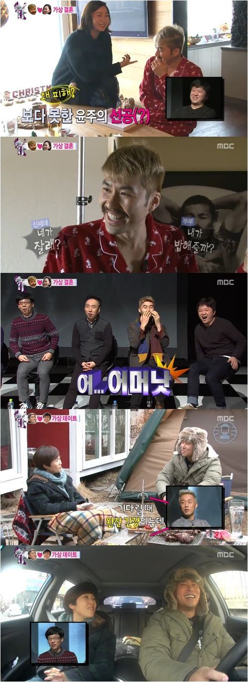 일단 이날 방송은 가상 결혼과 가상 데이트에 집중했다. 노홍철은 꼼짝 없이 모델 장윤주와 가상 결혼을 해야 했다. 길은 송은숙, 김숙과 데이트를 한 후 선택을 해야 했다. 당사자는 당황스러웠지만, 다른 멤버들은 재밌는 상황에 웃음을 터뜨렸다.