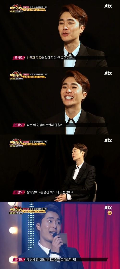 조성모는 4일 오후 방송된 JTBC 예능프로그램 '히든싱어2' 왕중왕전에 출연해 제작진과 인터뷰를 하던 중 일찍 탈락했던 당시를 떠올리며 "천국과 지옥을 왔다갔다한 기분이었다. 나는 왜 인생이 순탄치 않을까 생각했다"라고 말문을 열었다.