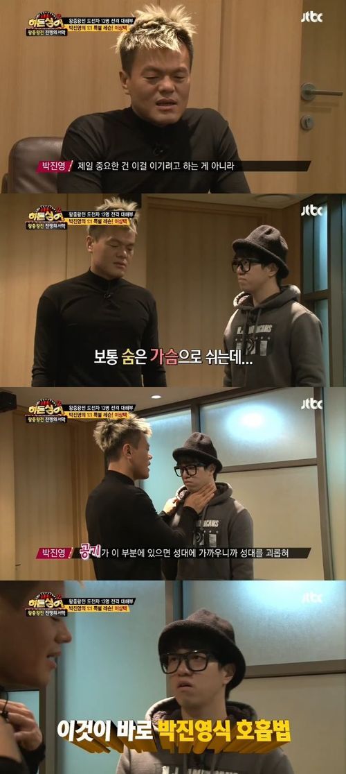 박진영은 4일 오후 방송된 JTBC 예능프로그램 '히든싱어2'에서 왕중왕전에 도전하는 자신의 모창자 이상택 씨를 위해 호흡법을 훈련시켰다.