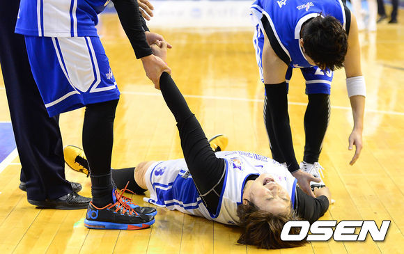 오프닝 경기 후반 레전드 올스타 유영주가 반칙 판정에 코트에 누워 장난을 치고 있다.