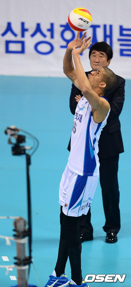 5일 오후 대전 충무실내체육관에서 '2013-2014 NH농협 V리그' 남자부 삼성화재와 현대캐피탈의 경기, 삼성화재 레오가 코트 밖에서 볼을 받아내고 있다.
