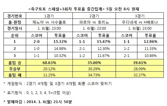 [축구토토] 국민체육진흥공단(www.kspo.or.kr)이 발행하는 체육진흥투표권 수탁사업자인 스포츠토토 공식 온라인 발매 사이트인 베트맨(www.betman.co.kr)은 오는 6일에 펼쳐지는 제노아-사수올로(1경기), 파르마-토리노(2경기), 우디네세-베로나(3경기)전 등 이탈리아 세리에A 3경기를 대상으로 한 축구토토 스페셜+ 3회차 투표율 중간집계 결과, 축구팬 68.63%는 제노아-사수올로(1경기)전에서 제노아의 완승을 예상했다.