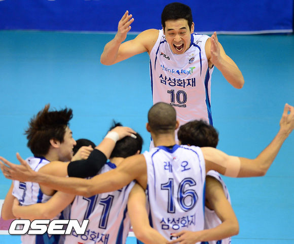 5일 오후 대전 충무실내체육관에서 '2013-2014 NH농협 V리그' 남자부 삼성화재와 현대캐피탈의 경기, 공격에 성공한 삼성화재 고희진이 동료들과 기쁨을 나누고 있다.