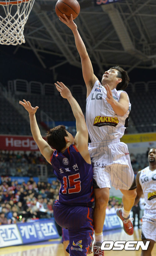 1쿼터, LG 양우섭이 오리온스 조효현의 수비를 피해 레이업슛을 시도하고 있다.