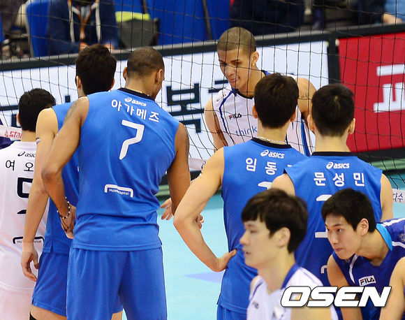 경기를 마치고 현대캐피탈 아가메즈와 삼성화재 레오가 악수를 나누고 있다. / rumi@osen.co.kr
