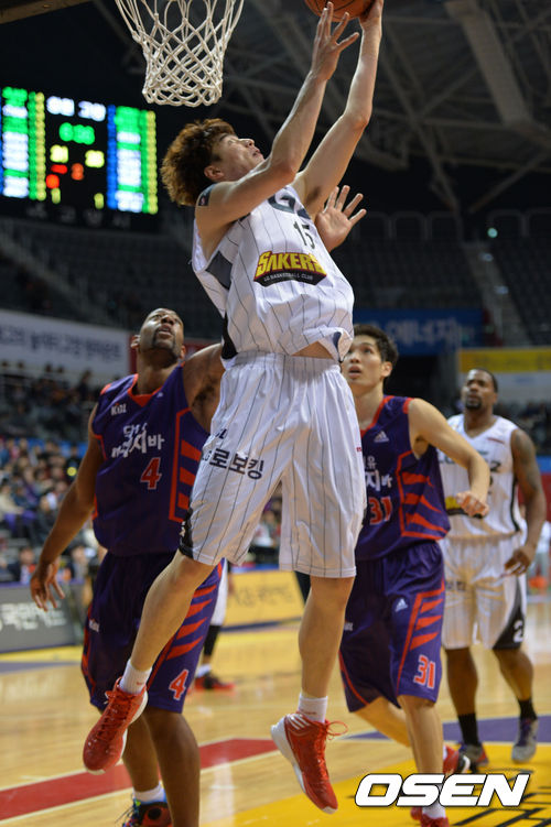 2쿼터, LG 김종규가 오리온스 윌리엄스의 수비를 피해 리버스 레이업을 시도하고 있다.