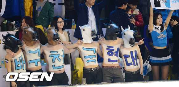 현대캐피탈 치어리더 김연정이 말 탈을 쓴 팬들과 함께 응원을 펼치고 있다. / rumi@osen.co.kr