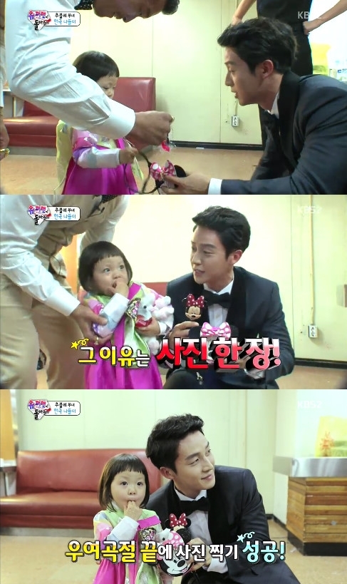 허경환은 5일 오후 방송된 KBS 2TV 예능프로그램 '해피선데이-슈퍼맨이 돌아왔다'(이하 슈퍼맨이 돌아왔다)에서 추사랑과 사진을 찍기 위해 미니마우스가 그려진 가방 등을 선물했다.