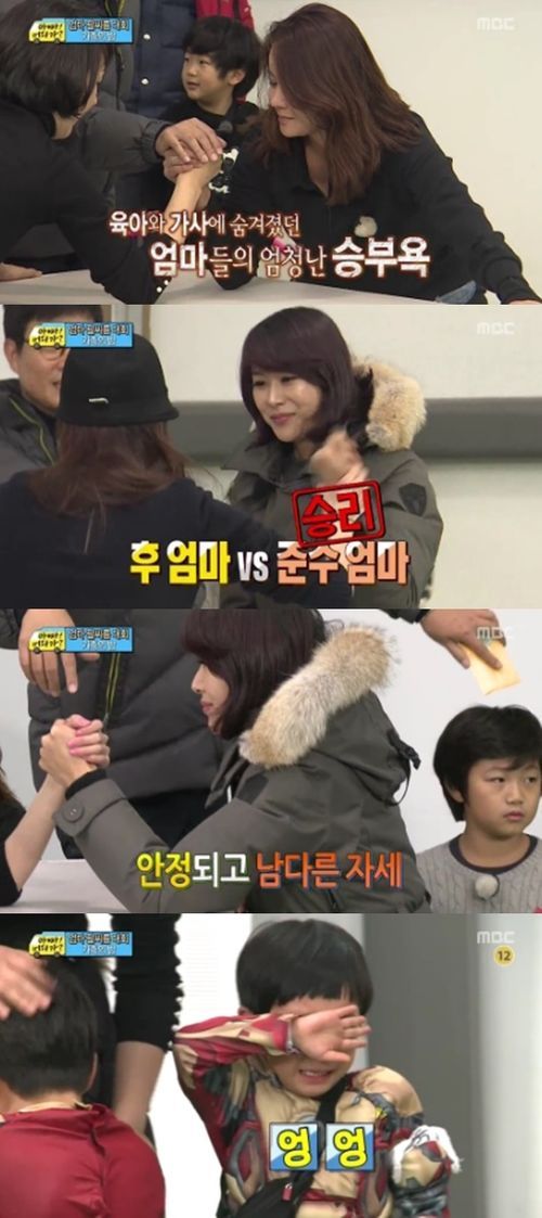 5일 방송된 MBC 예능 프로그램 '일밤 - 아빠 어디가'에는 엄마들의 팔씨름 대결이 담겼다. 초반 난색을 표하던 엄마들은 양말을 벗고, 다리를 쭉 벌려 자리를 잡는 등 대단한 승부욕으로 분위기를 후끈 달아오르게 만들었다.