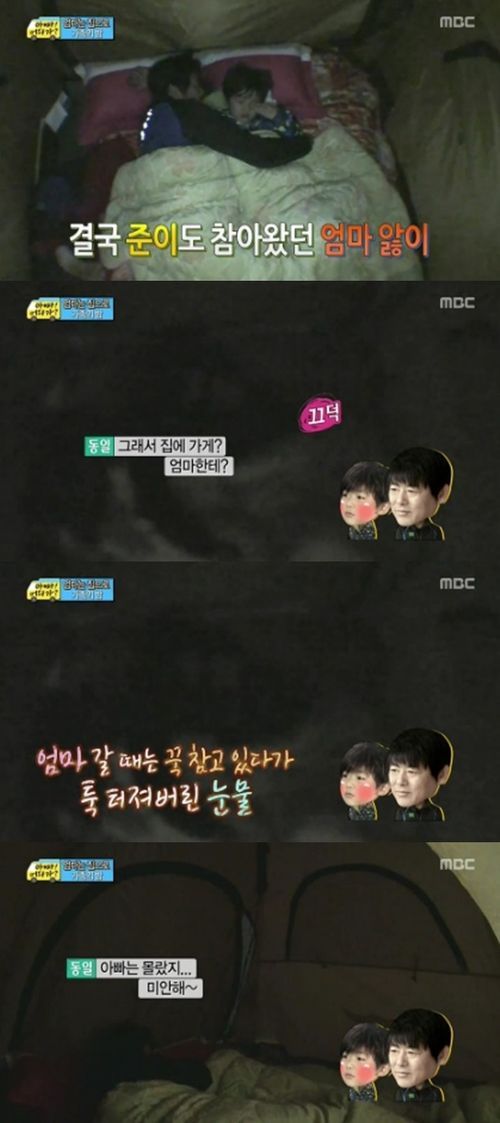 준이는 다른 아이들과 달리 엄마와 헤어지며 담담한 모습을 보였던 터. 그는 어른스럽게 엄마를 보낸 후 뒤에서 눈물을 흘려 안타까움을 자아냈다. 아들의 속마음을 모르고 있던 성동일은 "아빠가 몰랐다. 미안하다"고 달랬다.
