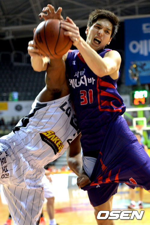 4쿼터, 오리온스 장재석과 LG 메시가 리바운드 다툼을 벌이고 있다.