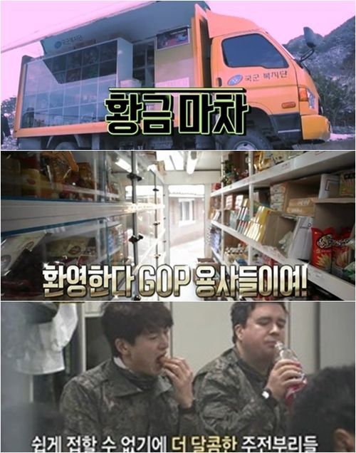 이 날 멤버들을 열광케 한 것이 등장해 눈길을 끌었다. 그것은 먹고 싶은 것을 백팩에 담아올 수 있는 황금마차. 김유일 병사, 손진영, 장혁 등은 산 아래에 있는 황금마차로 향했다. 황금마차는 PX가 없는 지역에 한 해 일주일에 한 두 번 찾아가는 이동식 PX.