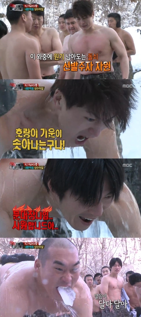 5일 오후 방송된 MBC 예능프로그램 '일밤-진짜사나이'에서는 GOP 근무를 끝내고 백골대대로 이동한 멤버들이 두꺼운 얼음을 깨고 냉수마찰을 하는 모습이 그려졌다. 멤버들은 살을 에는 추위 속에 냉수마찰을 앞두고 이상 행동을 보여 웃음을 자아냈다.