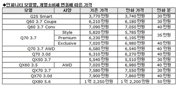 먼저, 인피니티는 브랜드 전 모델을 대상으로 개별소비세 변동에 따라 모델 별 최소 30만원에서 최대 50만원까지 가격을 인하했다.