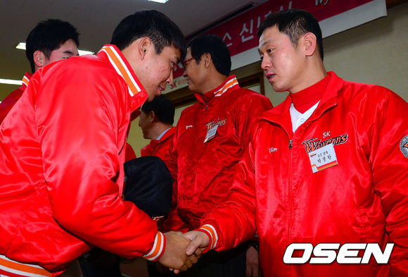 6일 오전 문학 야구장 내 위생교장에서 진행된 SK 와이번스 시무식에서 SK 와이번스 박경완 2군 감독이 한동민과 악수를 나누고 있다.
