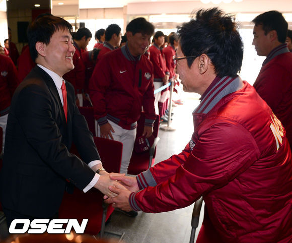 6일 오전 서울 목동구장에서 열린 넥센 히어로즈의 시무식, 하례식에서 이장석 대표와 염경엽 감독이 악수를 나누고 있다.