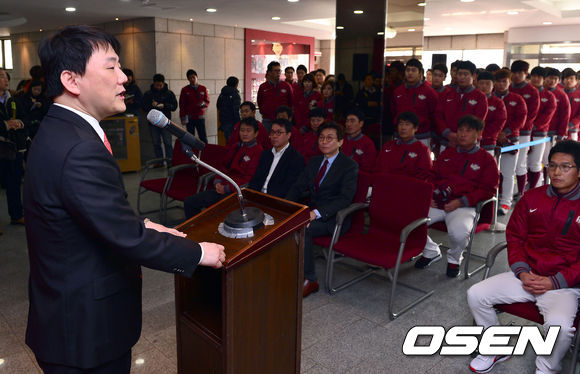 6일 오전 서울 목동구장에서 열린 넥센 히어로즈의 시무식에서 넥센 이장석 대표가 인사말을 하고 있다.
