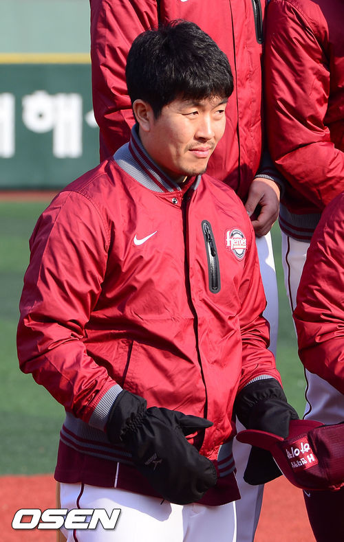 6일 오전 서울 목동구장에서 열린 넥센 히어로즈의 시무식 단체 포토타임때 김병현이 추운날씨에 벙어리 장갑을 낀채 포즈를 취하고 있다.