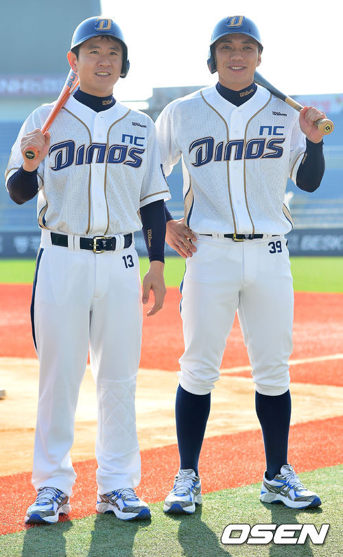 NC 손시헌과 이종욱이 그라운드 위에서 포즈를 취하고 있다.