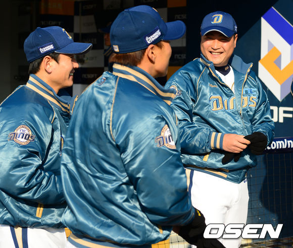 NC 이종욱 손시헌 이혜천이 얘기를 나누며 환하게 미소짓고 있다.