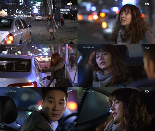 6일 오후 방송된 JTBC 월화드라마 '우리가 사랑할 수 있을까'(극본 박민정, 연출 김윤철)에서 윤정완(유진 분)은 술에 취한 채 택시를 잡던 중 길가에 세워진 오경수(엄태웅 분)의 차를 택시로 착각하고 올라탔다.