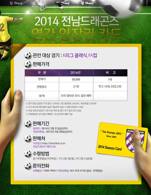 전남 드래곤즈는 7일 보도자료를 내고 7일부터 올해 전남의 모든 홈경기를 관전할 수 있는 연간권 카드의 판매를 시작했다고 밝혔다. 2014 연간권 카드는 홈 21번의 경기(K리그 클래식 19경기, FA컵 2경기)를 관람할 수 있다. 바코드형식으로 되어 있어 사용이 간편하고, 가격이 50,000원으로 저렴한 것이 특징이다.