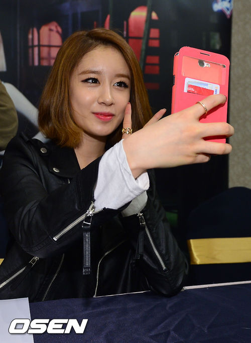 티아라 지연이 팬 사인회 중 팬의 핸드폰을 받아 셀프 카메라를 찍어주고 있다.