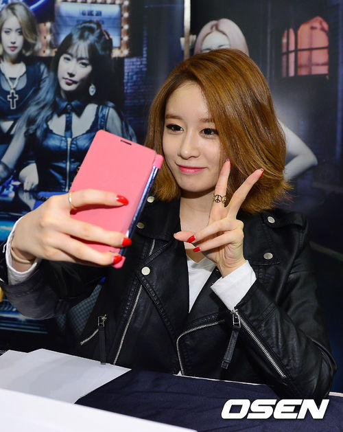 티아라 지연이 팬 사인회 중 팬의 핸드폰을 받아 셀프 카메라를 찍어주고 있다.