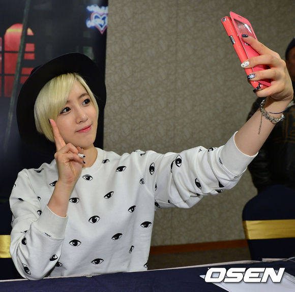 티아라 은정이 팬 사인회 중 팬의 핸드폰을 받아 셀프 카메라를 찍어주고 있다.