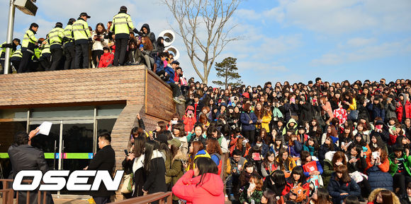 해태 순천 프리허그 행사에서 수많은 경찰들이 팬들의 안전사고를 예방하고 있다.