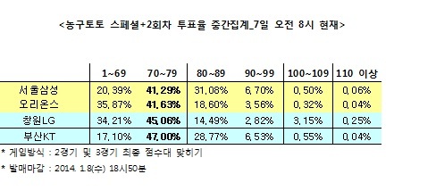 2013-14시즌 KBL 2경기 대상 농구토토 스페셜+ 2회차 투표율 중간집계 결과