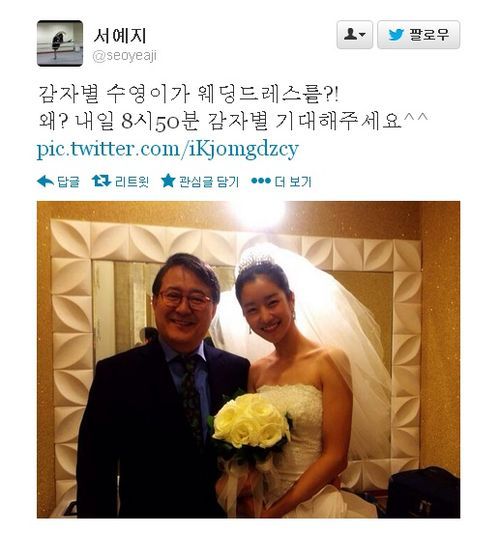 이와 관련해 서예지는 자신의 트위터를 통해 “감자별 수영이가 웨딩드레스를?! 왜? 내일 8시 50분 감자별 기대해주세요” 라는 글과 함께 ‘감자별’ 촬영 사진을 게재했다. 사진 속 웨딩드레스 차림의 서예지는 부케를 들고 노주현과 나란히 서서 환한 미소를 지어 보이고 있다.