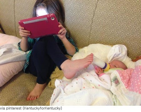 공개된 사진 속에는 한 여자 아이가 다리를 꼰 채 태블릿 PC를 양 손으로 잡은 채 집중하고 있다. 그런데 재미있는 것은 오른발로는 갓난아기의 젖병을 잡아 우유를 먹이는 모습이다.
