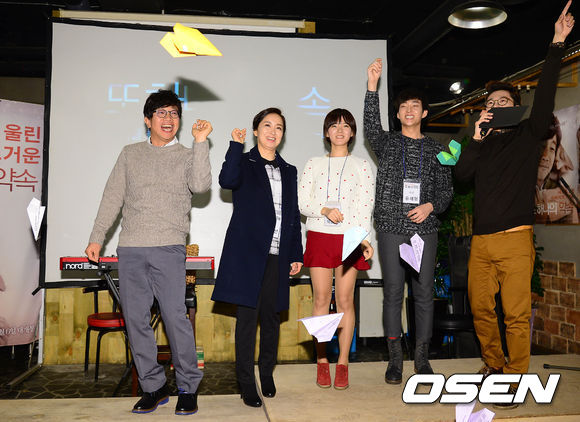 배우 유세형, 윤유선, 박희정, 박철민이 응원의 메시지를 담은 종이비행기를 날리고 있다.