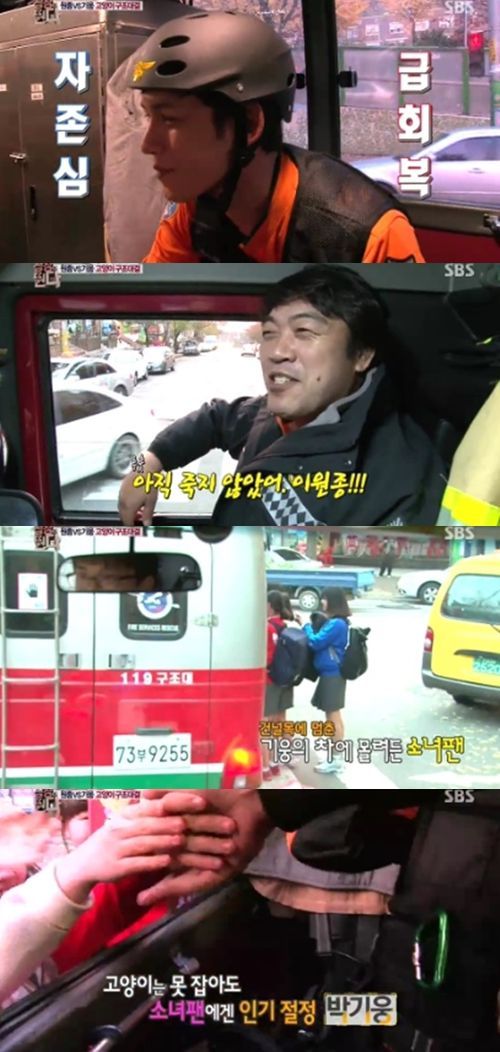 소녀팬들은 먼저 박기웅을 알아봤다. 이들은 구급차 안에 타고 있는 박기웅의 모습을 휴대폰 카메라로 촬영하며 "잘 생겼다", "이거 '심장이 뛴다' 촬영이냐"며 알은척 했다.