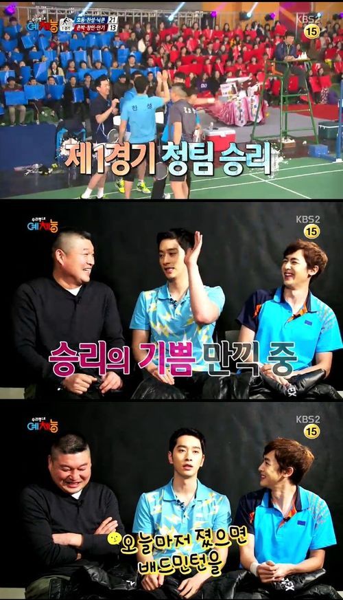 그룹 2PM의 찬성이 배드민턴 대결을 한 이래 사상 첫 승리를 거두며 기쁨을 맛봤다.