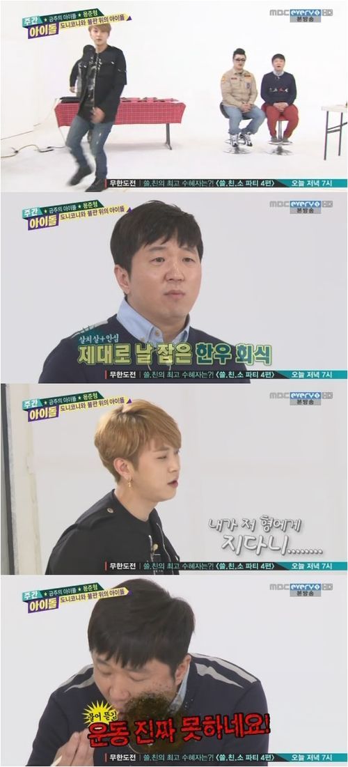용준형은 8일 방송된 MBC에브리원 예능프로그램 ‘주간아이돌-금주의 아이돌’에서 정형돈과 경보 대결을 했지만 패배하고 말았다.