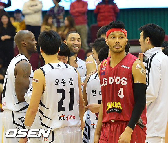 경기를 마치고 KT 조성민이 동료들과 기쁨을 나눌때 LG 문태종이 아쉬운 표정을 짓고 있다. / rumi@osen.co.kr