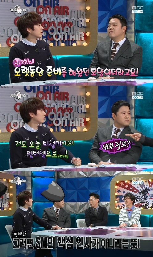 규현은 “비행기에서 인터넷으로 둘의 열애설을 접했다”고 말했다. 윤종신은 “그러면 SM의 핵심 인사가 아니라는 뜻”이라며 “강타, 김민종 등 핵심들을 다 알고있지 않았을까?”라고 물어 웃음을 자아냈다.