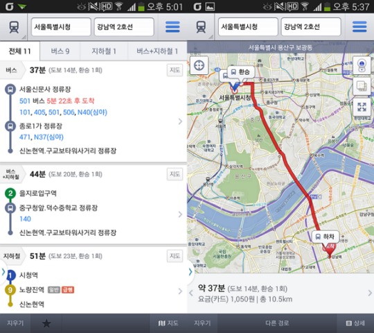 한편, 대중교통 경로비교 기능은 지난 10월 PC부터 적용됐으며, 안드로이드용 구글앱은 9일부터 플레이스토어에서 다운로드 받을 수 있다. 아이폰용 iOS버전은 1월말 앱스토어에 업데이트될 예정이다.