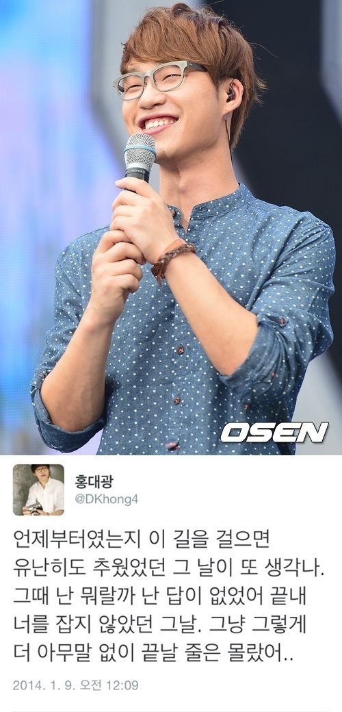 홍대광은 9일 0시를 막 넘긴 시각 “언제부터였는지 이 길을 걸으면 유난히도 추웠었던 그 날이 또 생각나. 그 때 난 뭐랄까. 난 답이 없었어. 끝내 너를 잡지 않았던 그 날. 그냥 그렇게 더 아무 말 없이 끝날 줄은 몰랐어..”라는 글을 게재했다. 과거의 연인과의 이별에 대한 독백과 같은 의문의 글은 팬들의 이목을 끌고 있다.