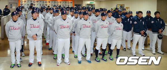 두산 선수단이 시무식에 참석해 김승연 사장의 이야기를 듣고 있다.