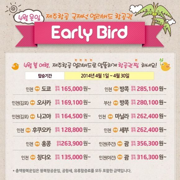 제주항공의 4월 얼리버드 항공권은 4월 1일부터 30일까지 적용되는 상품으로, 인천 도쿄 왕복 16만 5000원부터, 방콕 28만만 5100원부터, 홍콩 26만3900원부터 등 괌, 마닐라, 세부 등에 적용된다.