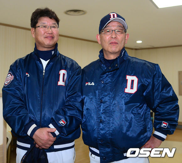 황병일 2군 감독과 송일수 1군 감독이 포토타임을 갖고 있다.
