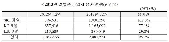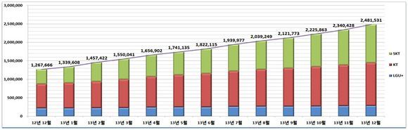 248만 명은 2012년 12월말 기준 126만 명에서 1년 만에 2배 가까이 늘어난 것으로, 전체 이동전화 시장 가입자(5400만명)의 4.55%에 해당하는 수치이다.