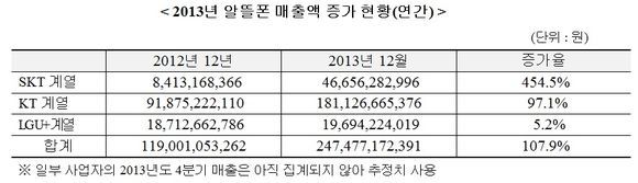알뜰폰 사업자들의 2013년 서비스 매출도 2012년(1190억 원) 보다 107% 증가한 2474억 원으로 나타났으며단말기 매출은 3783억원으로 집계됐다. 이 중 KT망 임대 알뜰폰 사업자들의 서비스 매출은 1811억원, SKT는 466억원, LG U+는 196억원 순으로 나타났다.