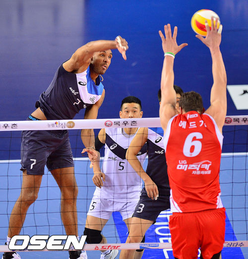 9일 오후 천안 유관순체육관에서 열린 '2013-2014 NH농협 V리그' 남자부 현대캐피탈과 LIG손해보험의 경기, 현대캐피탈 아가메즈가 강타를 날리고 있다.