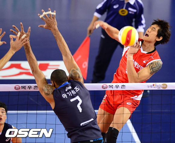 9일 오후 천안 유관순체육관에서 열린 '2013-2014 NH농협 V리그' 남자부 현대캐피탈과 LIG손해보험의 경기,LIG 손해보험 김요한이 강타를 날리고 있다.
