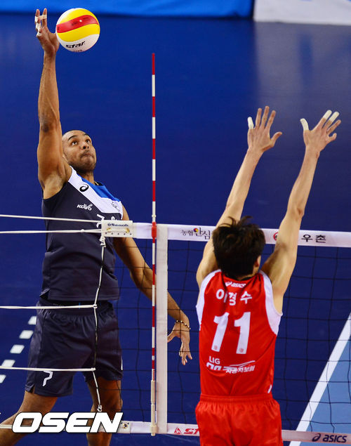 9일 오후 천안 유관순체육관에서 열린 '2013-2014 NH농협 V리그' 남자부 현대캐피탈과 LIG손해보험의 경기, 현대캐피탈 아가메즈가 연타를 넣고 있다.