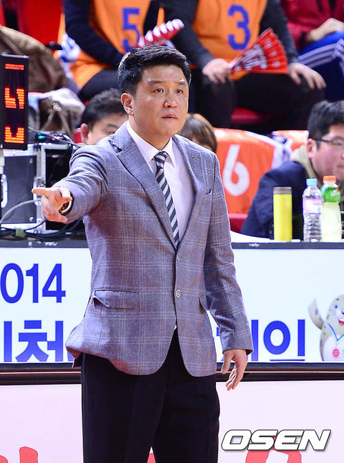 4쿼터 전자랜드 유도훈 감독이 선수들에게 작전을 지시하고 있다.